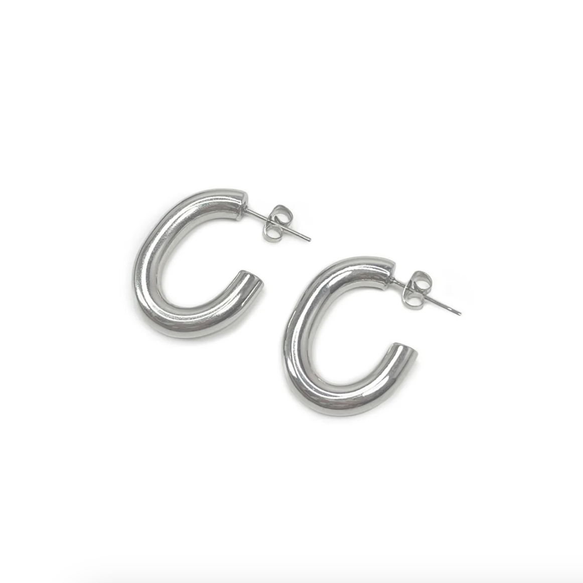 A pair of chunky, oval shape hoops with a unique twist to the classic hoop design. Crafted from high-quality stainless steel, these hoops offer durability and a sleek, polished look.
