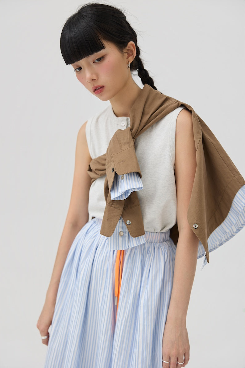 A sleeveless henley tank with a placket detail on the collar, and side tabs with button closures for movement and styling variations. Simple, with subtle structure.